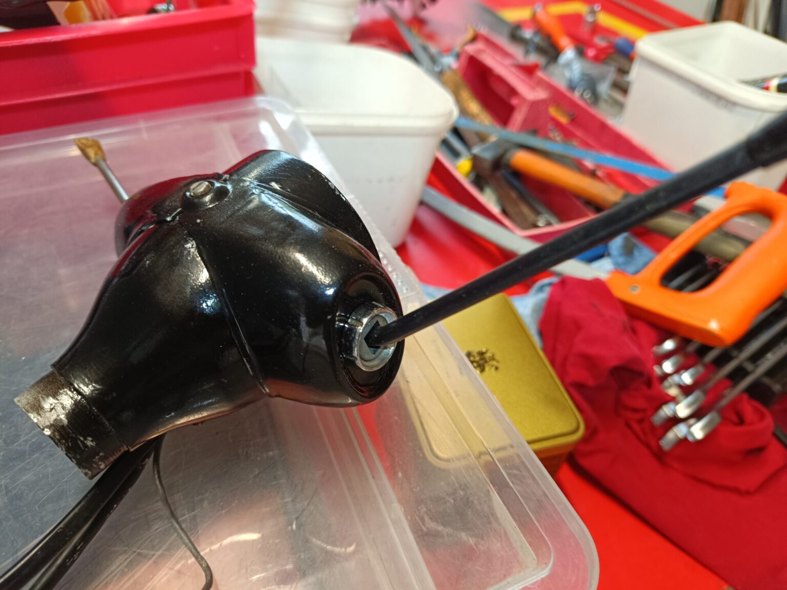 La refection de tous les compteurs, un travail de patience. Pour cela j’ai squatté la table de la salle à manger pendant quelques jours (toutes les femmes ne sont pas d’accord, bien se renseigner avant). Ensuite décapage du tableau de bord, traitement époxy, peinture d’origine blanc Triumph. Changement des rembourrages (crash pad).